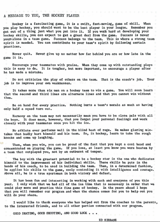 ED KIRRANE Letter to Brookline Hockey - 1967